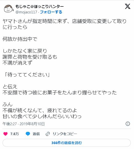 宅配員が謝罪に来た際、不満を抱えつつも「待っててください」と一言。そして、彼女は宅配員にお菓子をたくさん渡し、「甘いものを食べて、少し休んだらいいわ」と声をかけました。この対応は、ヤマト運輸の宅配員が直面する厳しい労働環境に対する理解と、優しさから来るものでした。