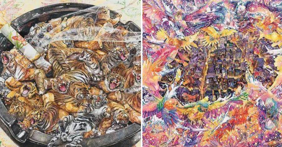 對于藝術家來說,靈感總是突然出現。趙娜有一次看到一個煙灰缸,突然覺得里面的煙頭和老虎很相像,于是就有了這幅創意十足的作品。
