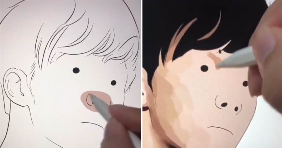 小伙伴都為美術生擔心,這樣的偶像人物,畫成了惡搞效果,麻煩可就大了,不曾想美術生一番騷操作,陳立農的輪廓漸漸的清晰起來,當畫到眼鏡的時候,才感覺到了美術生的實力。