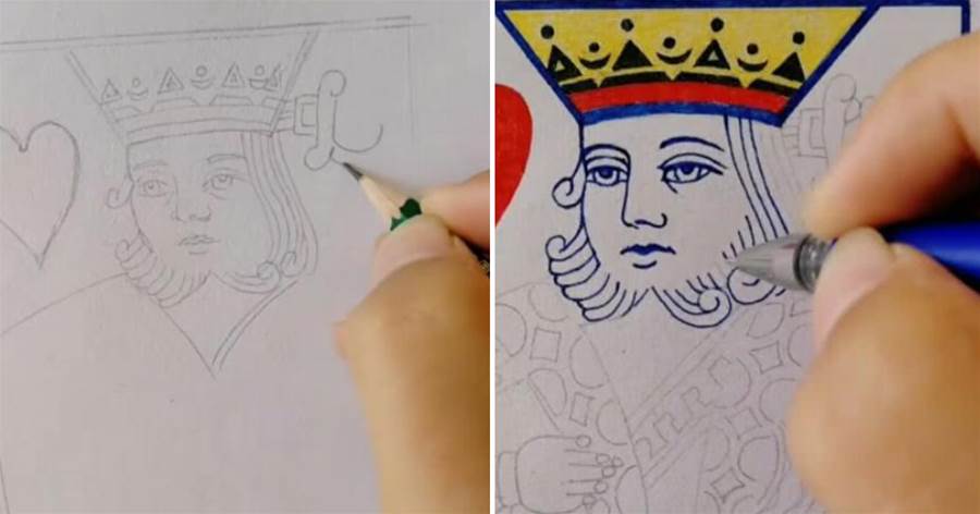 美術生先在紙上畫畫出撲克牌的輪廓,從線稿來看這是一張紅桃K,這可能是所有牌中最復雜的一張,難度還是很高的,所以不少網友都認為他是在開玩笑。